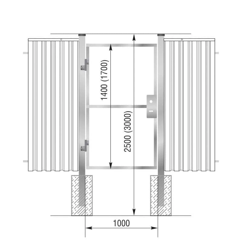 Комплект деталей для калитки, который включает: столб калитки с петлями и заглушкой, столб калитки с заглушкой, створка калитки, замок. Может быть использован для заполнения металлическими профильными листами или штакетником.